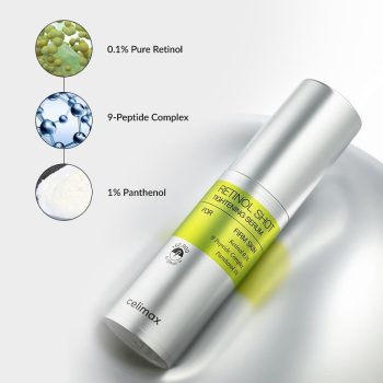 سرم رتینال سفت‌کننده Celimax Retinal Shot حاوی ۰.۱٪ رتینال خالص است که اثری قوی‌تر از رتینول برای کاهش چین‌وچروک و تحریک تولید کلاژن دارد. این سرم بافتی سبک و سریع‌الجذب دارد و بدون ایجاد حس چربی یا سنگینی روی پوست عمل می‌کند.